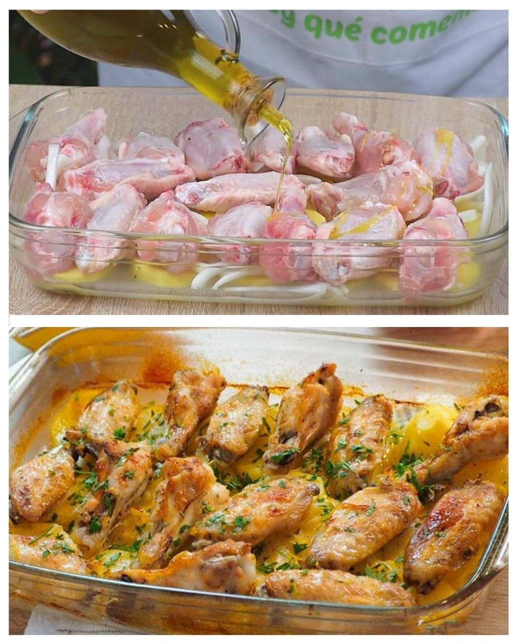 Oto pyszny przepis na przygotowanie pieczonych skrzydełek kurczaka z ziemniakami, smaczne i sycące danie: